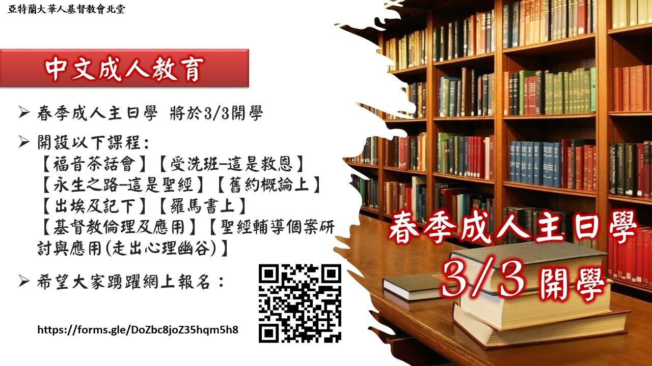 春季成人主日学将於3/3日开学,开设以下课程:【福音茶话会】【受洗班-这是救恩】【永生之路-这是圣经】【旧约概论上】【出埃及记下】【罗马书上】【基督教伦理及应用】【圣经辅导过案研讨与应用 (走出心理幽谷)】。希望大家踊跃使用二维码报名:https://forms.gle/DoZbc8joZ35hqm5h8