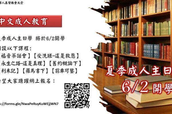 2024 夏季成人主日学 20 5 月, 2024 Posted By: yz NEWS-CN 中文 (简体) pll_664bf7e2cda73 夏季成人主日学将於 6/2 开学,开设以下课程:【福音茶话会】【受洗班-这是救恩】【永生之路-这是真... Continue reading