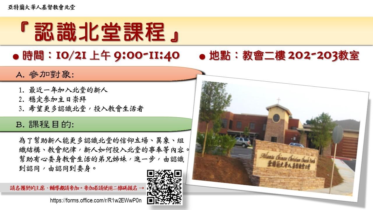 Posted on 10/15/2023 Posted By: yz Categories: NEWS-TW, 最新消息-TW 「認識北堂課程」:10/21 (六)上午 9:00-11:40。為了幫助新人能更多認識北堂的信仰立場、異象、組織結構、教會紀律、如何投入北堂的事奉等內容。邀請各團契中 “最近一年穩定參加主日崇拜的新人” 參加此課程。(請使用後附海報上二維碼報名)