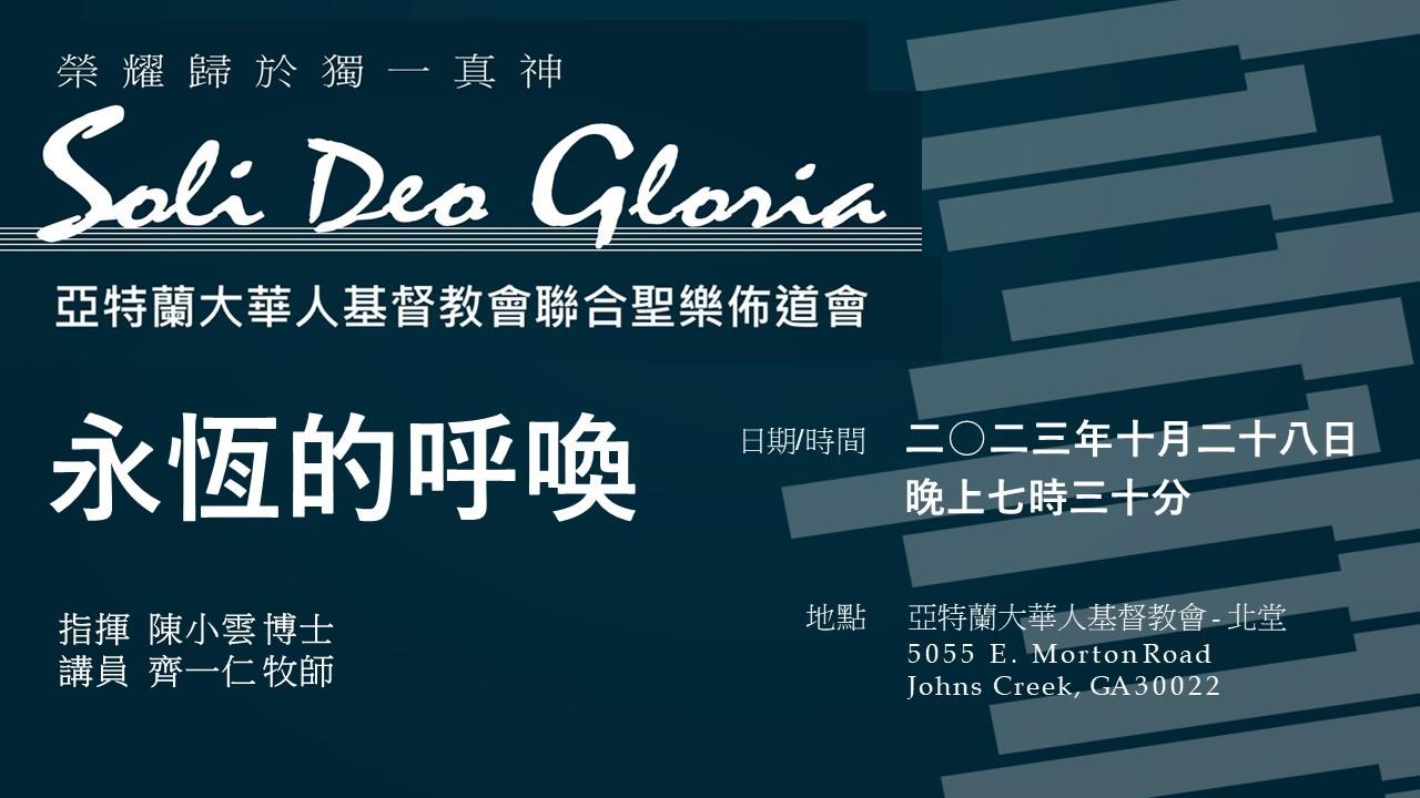 Posted on 10/18/2023 Posted By: yz Categories: NEWS-TW, 最新消息-TW 亞特蘭大華人聯合詩班福音佈道會 《永恆的呼喚》:10/28日 7:30pm在北堂舉行,見證主的榮美。 指揮:陳小雲博士 講員:齊一仁牧師
