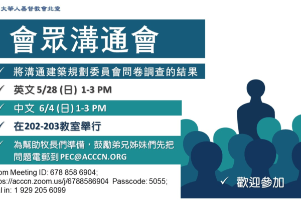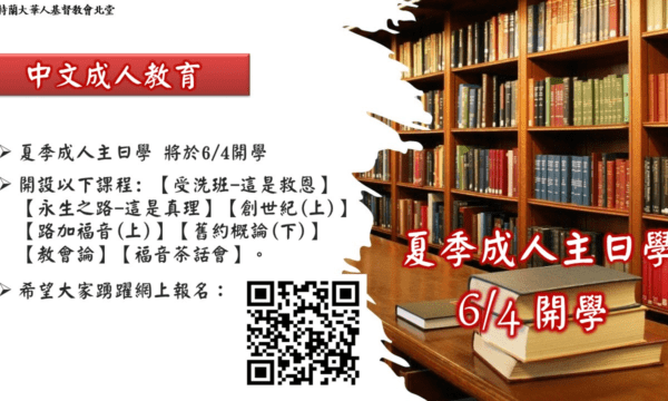 夏季成人主日學 6/4 日開學 05/21/2023 Posted By: yz NEWS-TW 中文 (繁體) pll_646a8c6f5d04b 夏季成人主日學: 6/4日開學,開設以下課程:【福音茶話會】【受洗班-這是救恩】【永生之路-這是真理... Continue reading